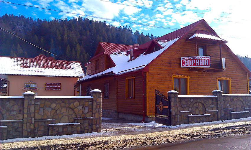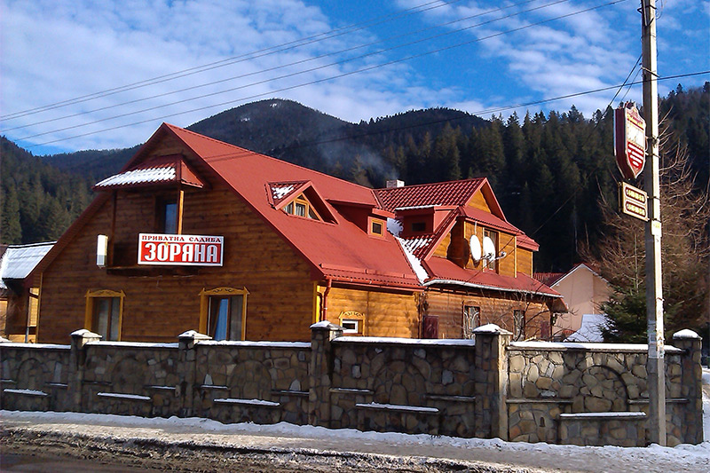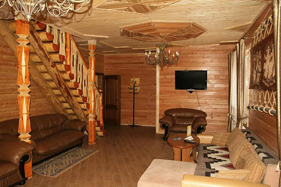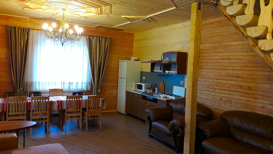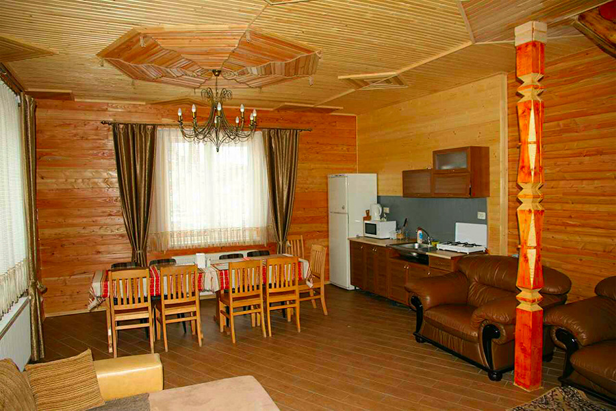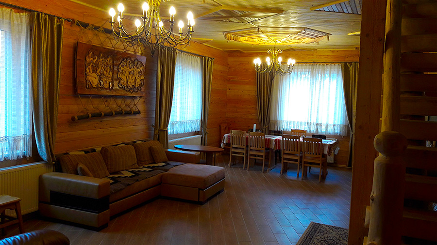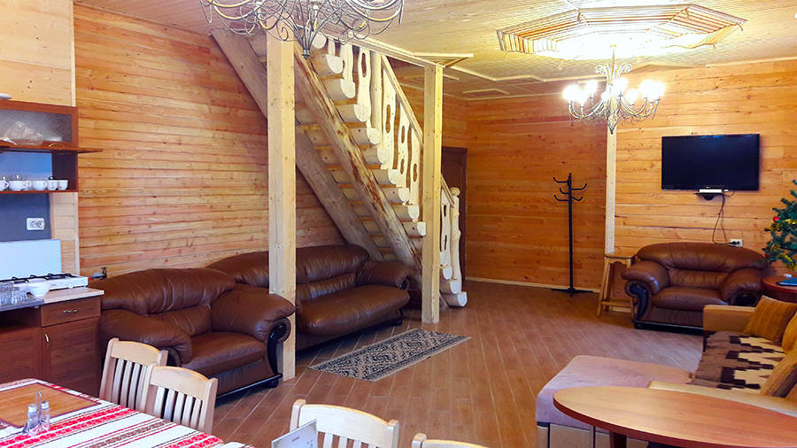 На першому поверсі знаходиться столовий зал з м'яким кутком та кухнею для самостійного приготування їжі, кладова-сушка для лижнього спорядження та двокімнатний номер «Делюкс» з санвузлом.