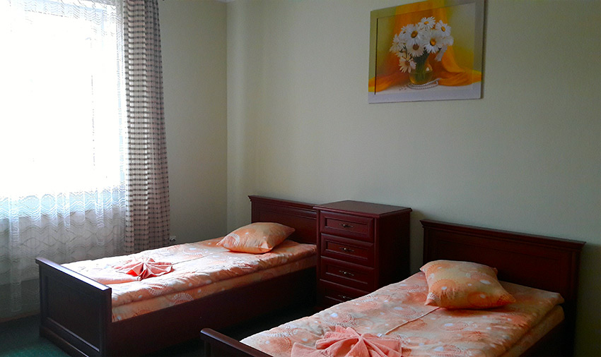 «Напівлюкс двомісний» — однокімнатний двомісний номер площею 18 м2. Містить одне двоспальне ліжко, супутникове ТБ, одне м'яке розкладне крісло, шафу для одягу, санвузол (душ, унітаз, умивальник, фен).